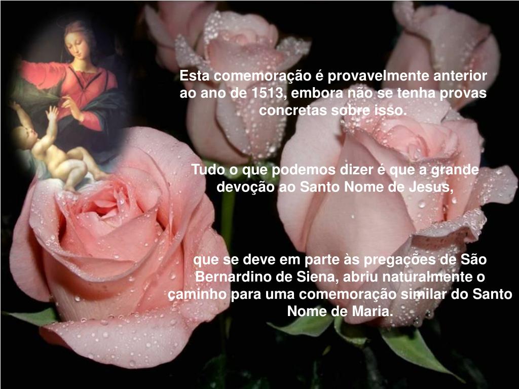 Esta comemoração é provavelmente anterior ao ano de 1513, embora não se tenha provas concretas sobre isso. Tudo o que podemos dizer é que a grande devoção ao Santo Nome de Jesus, que se deve em parte às pregações de São Bernardino de Siena, abriu naturalmente o caminho para uma comemoração similar do Santo Nome de Maria.