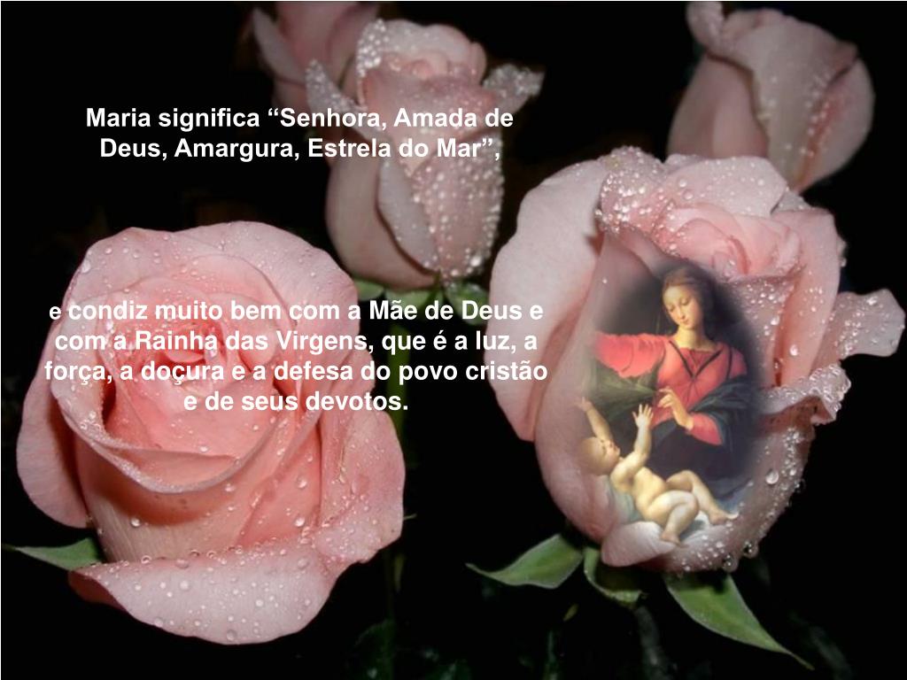 Maria significa “Senhora, Amada de Deus, Amargura, Estrela do Mar”, e condiz muito bem com a Mãe de Deus e com a Rainha das Virgens, que é a luz, a força, a doçura e a defesa do povo cristão e de seus devotos.