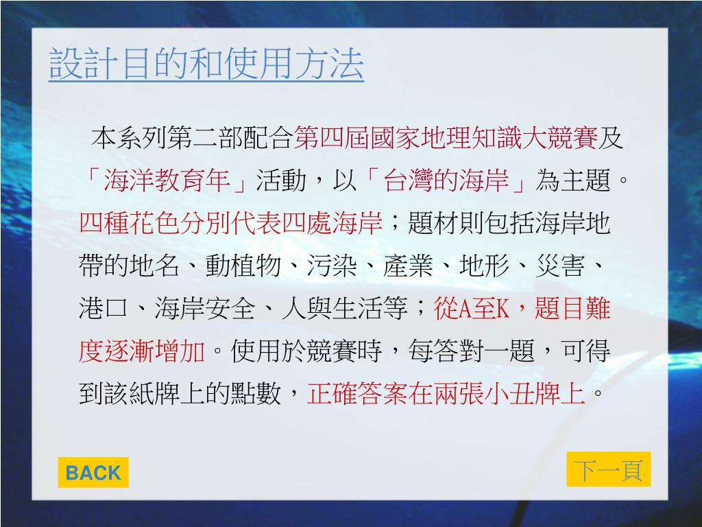 設計目的和使用方法 本系列第二部配合第四屆國家地理知識大競賽及「海洋教育年」活動,以「台灣的海岸」為主題。四種花色分別代表四處海岸;題材則包括海岸地帶的地名、動植物、污染、產業、地形、災害、港口、海岸安全、人與生活等;從A至K,題目難度逐漸增加。使用於競賽時,每答對一題,可得到該紙牌上的點數,正確答案在兩張小丑牌上。 下一頁 BACK