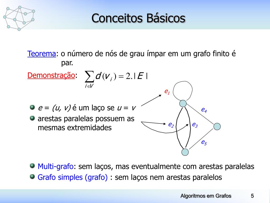 e1 • e = (u, v) é um laço se u = v • arestas paralelas possuem as mesmas extremidades e4 e2 e3 e5 Conceitos Básicos Teorema: o número de nós de grau ímpar em um grafo finito é par. Demonstração: • Multi-grafo: sem laços, mas eventualmente com arestas paralelas • Grafo simples (grafo) : sem laços nem arestas paralelos Algoritmos em Grafos