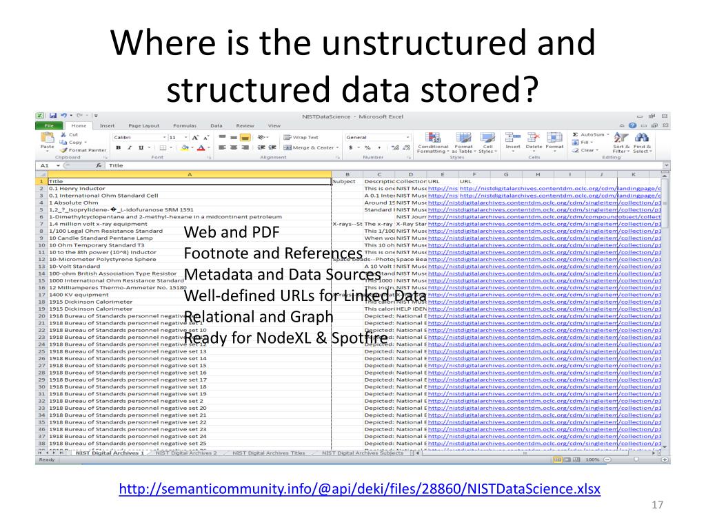 Where is the unstructured and structured data stored? Web and PDF Footnote and References Metadata and Data Sources Well-defined URLs for Linked Data Relational and Graph Ready for NodeXL & Spotfire http://semanticommunity.info/@api/deki/files/28860/NISTDataScience.xlsx