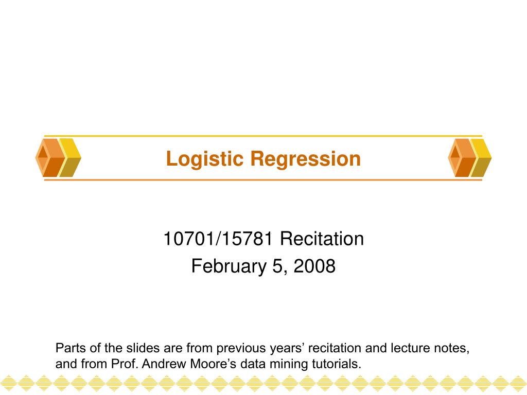 Logistic Regression. 10701 /15781 Recitation February 5, 2008. Parts of the slides are from previous years’ recitation and lecture notes, and from Prof. Andrew Moore’s data mining tutorials. Discriminative Classifier. Learn P(Y|X) directly Logistic regression for binary classification: