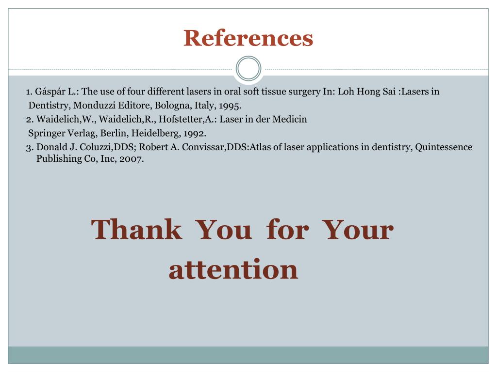 References 1. Gáspár L.: The use of four different lasers in oral soft tissue surgery In: Loh Hong Sai :Lasers in Dentistry, Monduzzi Editore, Bologna, Italy, 1995. 2. Waidelich,W., Waidelich,R., Hofstetter,A.: Laser in der Medicin Springer Verlag, Berlin, Heidelberg, 1992. 3. Donald J. Coluzzi,DDS; Robert A. Convissar,DDS:Atlas of laser applications in dentistry, Quintessence Publishing Co, Inc, 2007. Thank You for Your attention