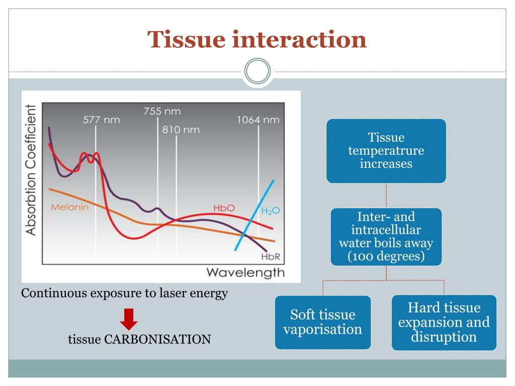 Tissue interaction Continuous exposure to laser energy tissue CARBONISATION