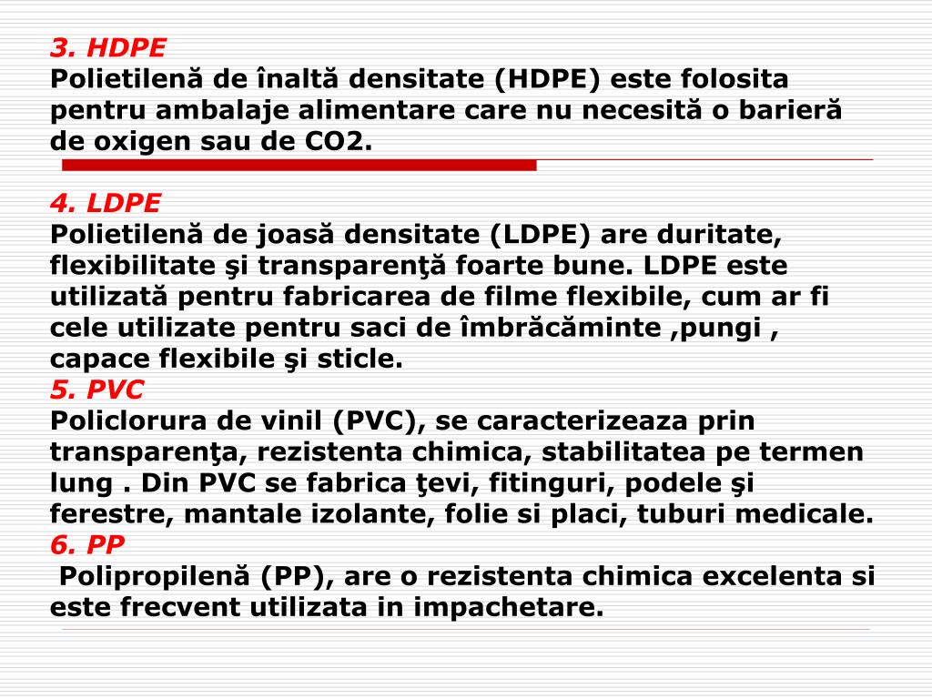 3. HDPEPolietilenă de înaltă densitate (HDPE) este folosita pentru ambalaje alimentare care nu necesită o barieră de oxigen sau de CO2. 4. LDPEPolietilenă de joasă densitate (LDPE) are duritate, flexibilitate şi transparenţă foarte bune. LDPE este utilizată pentru fabricarea de filme flexibile, cum ar fi cele utilizate pentru saci de îmbrăcăminte ,pungi , capace flexibile şi sticle. 5. PVCPoliclorura de vinil (PVC), se caracterizeaza prin transparenţa, rezistenta chimica, stabilitatea pe termen lung . Din PVC se fabrica ţevi, fitinguri, podele şi ferestre, mantale izolante, folie si placi, tuburi medicale. 6. PP Polipropilenă (PP), are o rezistenta chimica excelenta si este frecvent utilizata in impachetare.