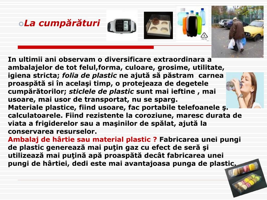 La cumpărături In ultimii ani observam o diversificare extraordinara a ambalajelor de tot felul,forma, culoare, grosime, utilitate, igiena stricta; folia de plastic ne ajută să păstram carnea proaspătă si în acelaşi timp, o protejeaza de degetele cumpărătorilor; sticlele de plastic sunt mai ieftine , mai usoare, mai usor de transportat, nu se sparg. Materiale plastice, fiind usoare, fac portabile telefoanele şi calculatoarele. Fiind rezistente la coroziune, maresc durata de viata a frigiderelor sau a maşinilor de spălat, ajută la conservarea resurselor. Ambalaj de hârtie sau material plastic ? Fabricarea unei pungi de plastic generează mai puţin gaz cu efect de seră şi utilizează mai puţină apă proaspătă decât fabricarea unei pungi de hârtiei, dedi este mai avantajoasa punga de plastic.
