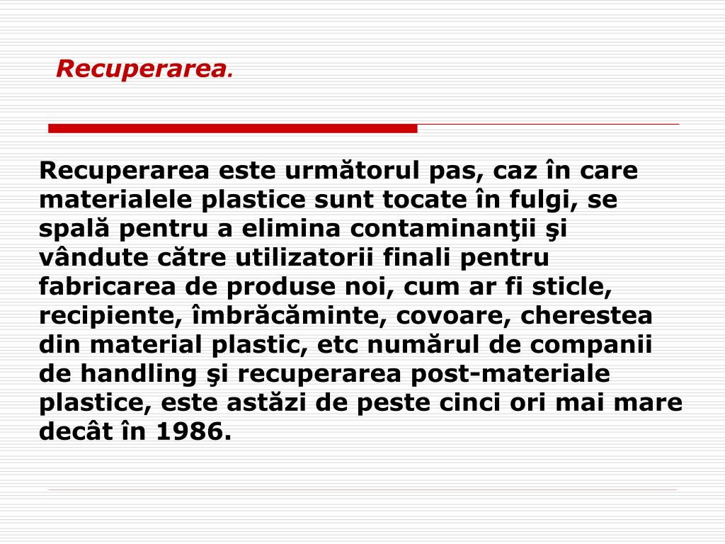 Recuperarea. Recuperarea este următorul pas, caz în care materialele plastice sunt tocate în fulgi, se spală pentru a elimina contaminanţii şi vândute către utilizatorii finali pentru fabricarea de produse noi, cum ar fi sticle, recipiente, îmbrăcăminte, covoare, cherestea din material plastic, etc numărul de companii de handling şi recuperarea post-materiale plastice, este astăzi de peste cinci ori mai mare decât în 1986.