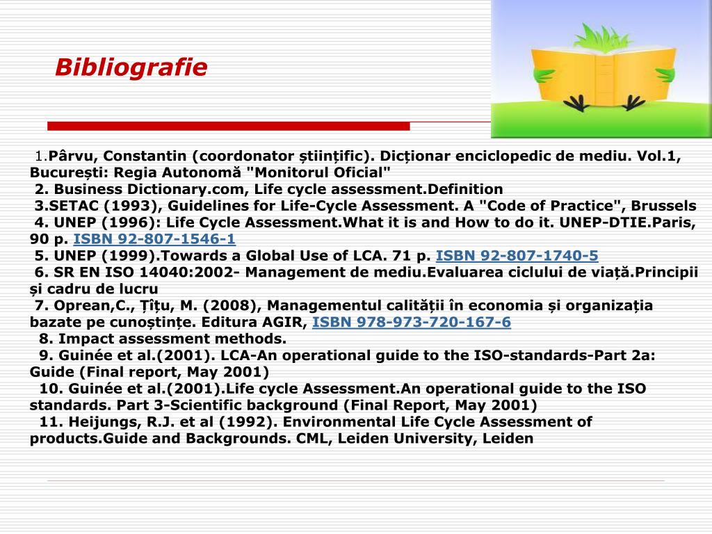 Bibliografie • 1.Pârvu, Constantin (coordonator științific). Dicționar enciclopedic de mediu. Vol.1, București: Regia Autonomă "Monitorul Oficial" • 2. Business Dictionary.com, Life cycle assessment.Definition • 3.SETAC (1993), Guidelines for Life-Cycle Assessment. A "Code of Practice", Brussels • 4. UNEP (1996): Life Cycle Assessment.What it is and How to do it. UNEP-DTIE.Paris, 90 p. ISBN 92-807-1546-1 • 5. UNEP (1999).Towards a Global Use of LCA. 71 p. ISBN 92-807-1740-5 • 6. SR EN ISO 14040:2002- Management de mediu.Evaluarea ciclului de viață.Principii și cadru de lucru • 7. Oprean,C., Țîțu, M. (2008), Managementul calității în economia și organizația bazate pe cunoștințe. Editura AGIR, ISBN 978-973-720-167-6 • 8. Impact assessment methods. • 9. Guinée et al.(2001). LCA-An operational guide to the ISO-standards-Part 2a: Guide (Final report, May 2001) • 10. Guinée et al.(2001).Life cycle Assessment.An operational guide to the ISO standards. Part 3-Scientific background (Final Report, May 2001) • 11. Heijungs, R.J. et al (1992). Environmental Life Cycle Assessment of products.Guide and Backgrounds. CML, Leiden University, Leiden