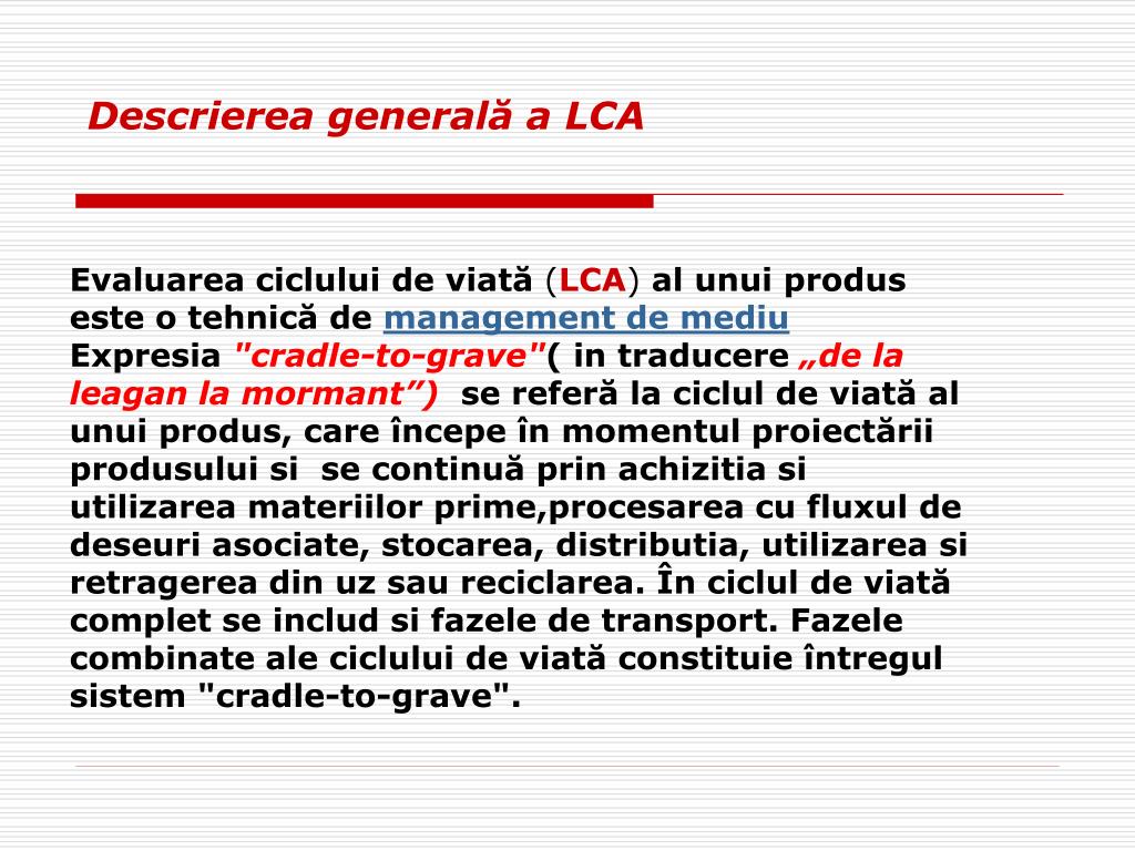 Descrierea generală a LCA Evaluarea ciclului de viată (LCA) al unui produs este o tehnică demanagement de mediu Expresia "cradle-to-grave"( in traducere „de la leagan la mormant”) se referă la ciclul de viată al unui produs, care începe în momentul proiectării produsului si se continuă prin achizitia si utilizarea materiilor prime,procesarea cu fluxul de deseuri asociate, stocarea, distributia, utilizarea si retragerea din uz sau reciclarea. În ciclul de viată complet se includ si fazele de transport. Fazele combinate ale ciclului de viată constituie întregul sistem "cradle-to-grave".