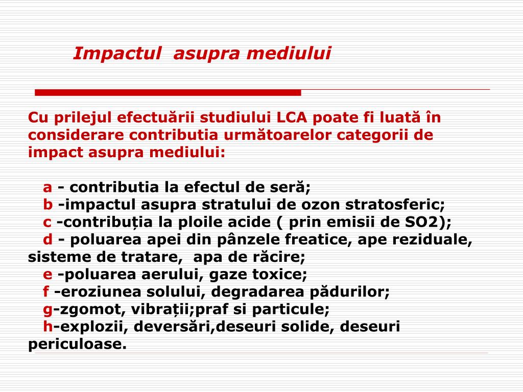 Impactul asupra mediului Cu prilejul efectuării studiului LCA poate fi luată în considerare contributia următoarelor categorii de impact asupra mediului: a- contributia la efectul de seră; b-impactul asupra stratului de ozon stratosferic; c-contribuția la ploile acide ( prin emisii de SO2); d- poluarea apei din pânzele freatice, ape reziduale, sisteme de tratare, apa de răcire; e-poluarea aerului, gaze toxice; f-eroziunea solului, degradarea pădurilor; g-zgomot, vibrații;praf si particule; h-explozii, deversări,deseuri solide, deseuri periculoase.