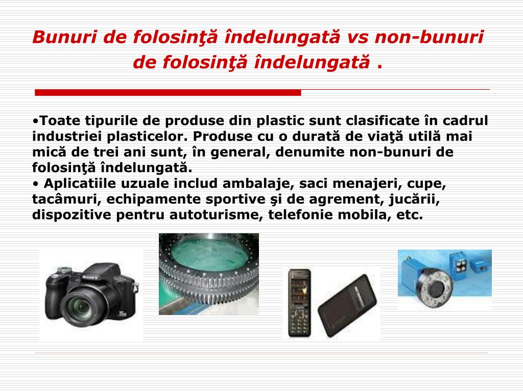 Bunuri de folosinţă îndelungată vs non-bunuri de folosinţă îndelungată . • Toate tipurile de produse din plastic sunt clasificate în cadrul industriei plasticelor. Produse cu o durată de viaţă utilă mai mică de trei ani sunt, în general, denumite non-bunuri de folosinţă îndelungată. • Aplicatiile uzuale includ ambalaje, saci menajeri, cupe, tacâmuri, echipamente sportive şi de agrement, jucării, dispozitive pentru autoturisme, telefonie mobila, etc.