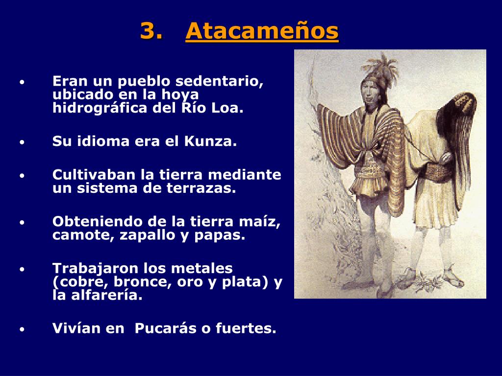 Atacameños • Eran un pueblo sedentario, ubicado en la hoya hidrográfica del Río Loa. • Su idioma era el Kunza. • Cultivaban la tierra mediante un sistema de terrazas. • Obteniendo de la tierra maíz, camote, zapallo y papas. • Trabajaron los metales (cobre, bronce, oro y plata) y la alfarería. • Vivían en Pucarás o fuertes.