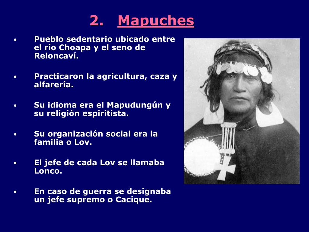 Mapuches • Pueblo sedentario ubicado entre el río Choapa y el seno de Reloncaví. • Practicaron la agricultura, caza y alfarería. • Su idioma era el Mapudungún y su religión espiritista. • Su organización social era la familia o Lov. • El jefe de cada Lov se llamaba Lonco. • En caso de guerra se designaba un jefe supremo o Cacique.
