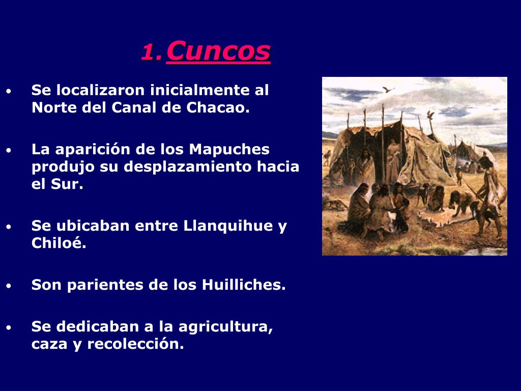 Cuncos • Se localizaron inicialmente al Norte del Canal de Chacao. • La aparición de los Mapuches produjo su desplazamiento hacia el Sur. • Se ubicaban entre Llanquihue y Chiloé. • Son parientes de los Huilliches. • Se dedicaban a la agricultura, caza y recolección.