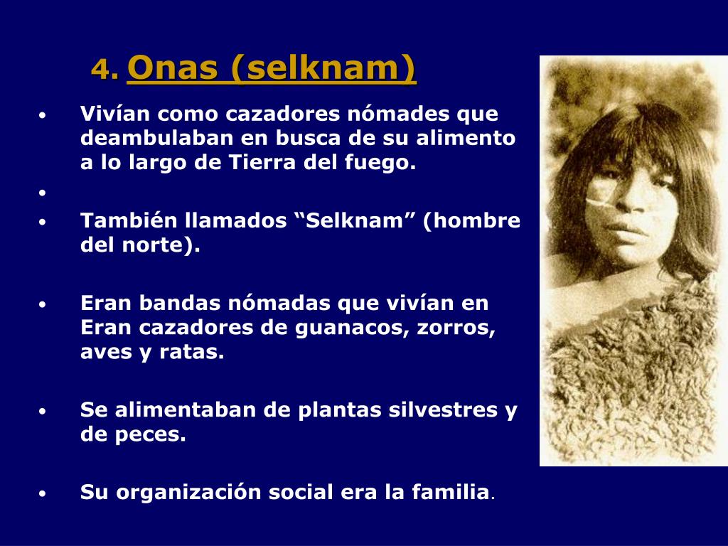 Onas (selknam) • Vivían como cazadores nómades que deambulaban en busca de su alimento a lo largo de Tierra del fuego. • También llamados “Selknam” (hombre del norte). • Eran bandas nómadas que vivían en Eran cazadores de guanacos, zorros, aves y ratas. • Se alimentaban de plantas silvestres y de peces. • Su organización social era la familia.