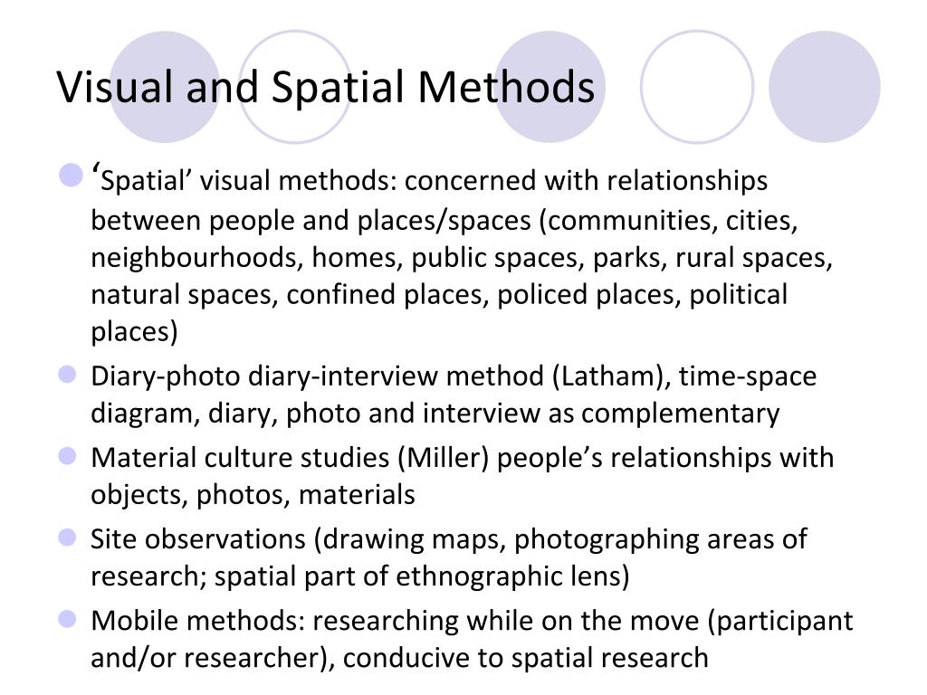 Visual and Spatial Methods • ‘Spatial’ visual methods: concerned with relationships between people and places/spaces (communities, cities, neighbourhoods, homes, public spaces, parks, rural spaces, natural spaces, confined places, policed places, political places) • Diary-photo diary-interview method (Latham), time-space diagram, diary, photo and interview as complementary • Material culture studies (Miller) people’s relationships with objects, photos, materials • Site observations (drawing maps, photographing areas of research; spatial part of ethnographic lens) • Mobile methods: researching while on the move (participant and/or researcher), conducive to spatial research