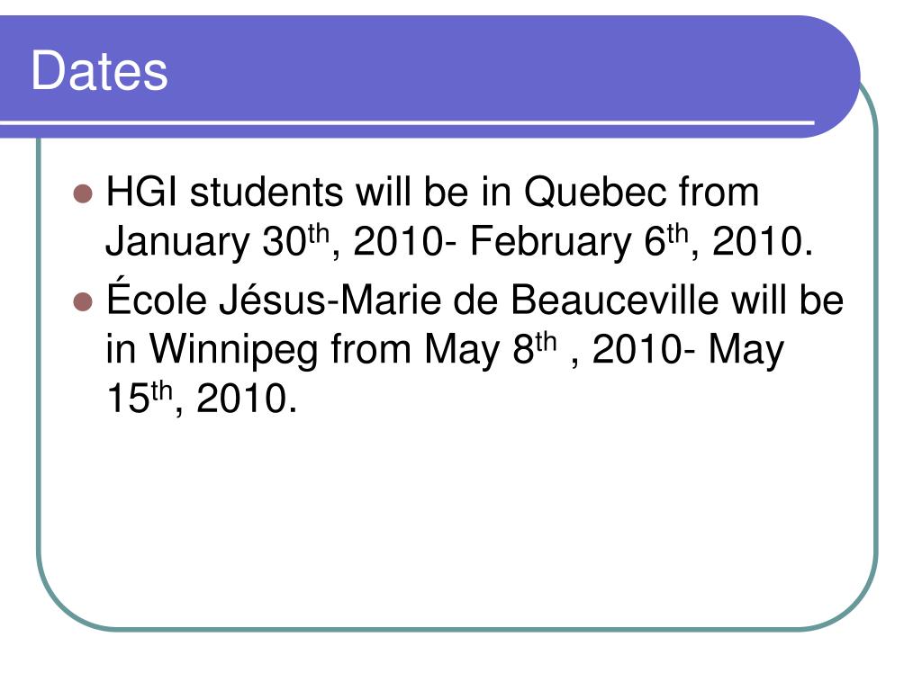Dates • HGI students will be in Quebec from January 30th, 2010- February 6th, 2010. • École Jésus-Marie de Beauceville will be in Winnipeg from May 8th , 2010- May 15th, 2010.