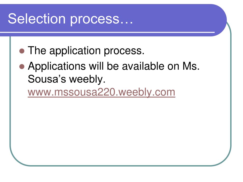 Selection process… • The application process. • Applications will be available on Ms. Sousa’s weebly. www.mssousa220.weebly.com