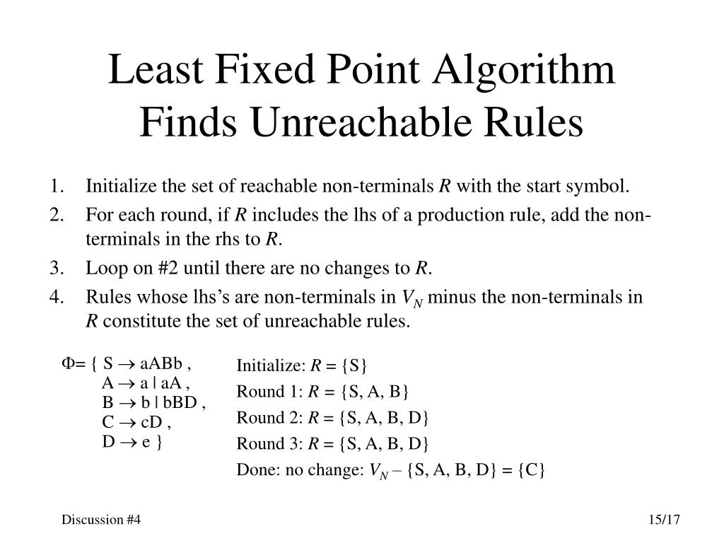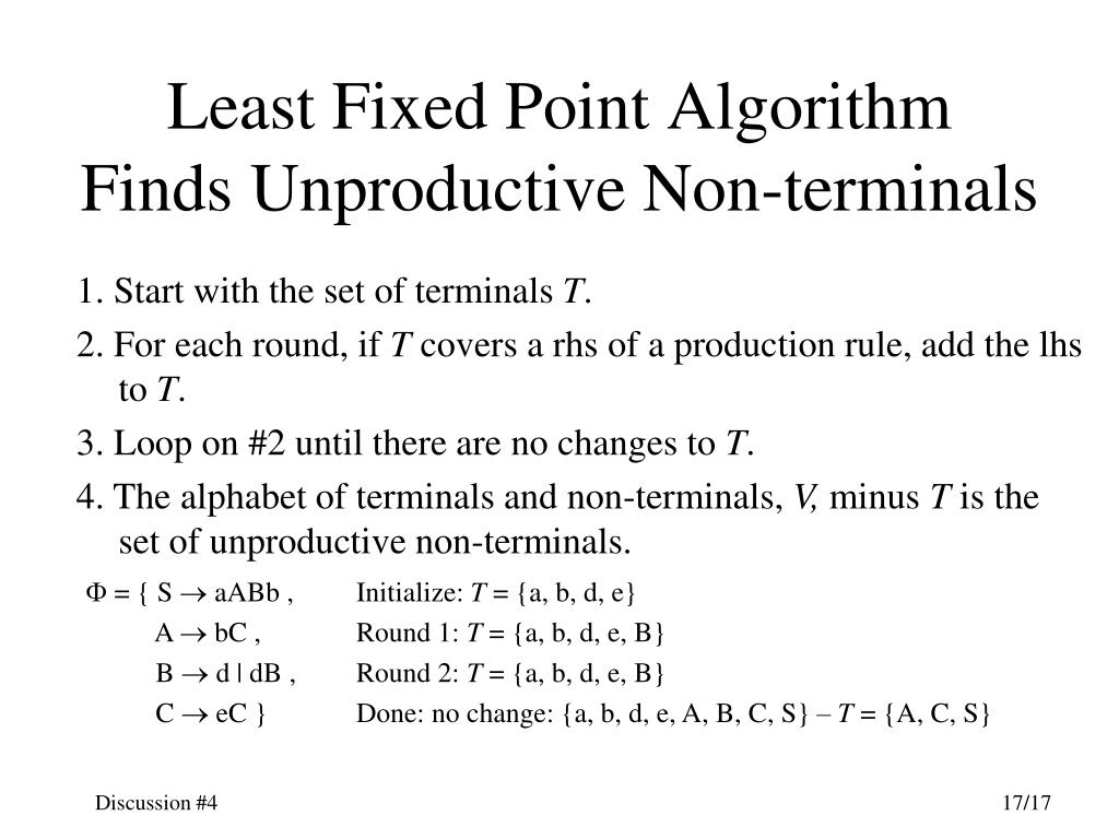 Least Fixed Point AlgorithmFinds Unproductive Non-terminals 1. Start with the set of terminals T. 2. For each round, if T covers a rhs of a production rule, add the lhs to T. 3. Loop on #2 until there are no changes to T. 4. The alphabet of terminals and non-terminals, V, minus T is the set of unproductive non-terminals. = { S aABb , A bC , B d | dB , C eC } Initialize: T = {a, b, d, e} Round 1: T = {a, b, d, e, B} Round 2: T = {a, b, d, e, B} Done: no change: {a, b, d, e, A, B, C, S} – T = {A, C, S}