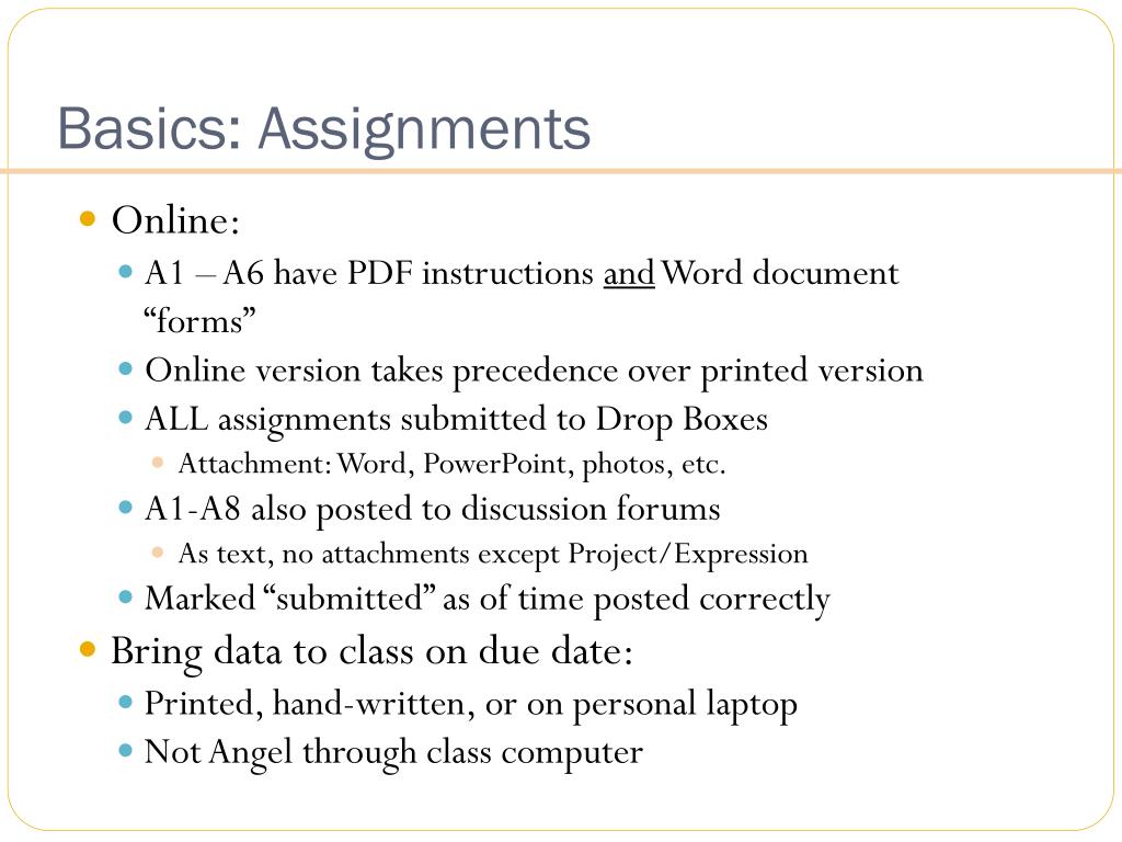 Basics: Assignments • Online: • A1 – A6 have PDF instructions and Word document “forms” • Online version takes precedence over printed version • ALL assignments submitted to Drop Boxes • Attachment: Word, PowerPoint, photos, etc. • A1-A8 also posted to discussion forums • As text, no attachments except Project/Expression • Marked “submitted” as of time posted correctly • Bring data to class on due date: • Printed, hand-written, or on personal laptop • Not Angel through class computer