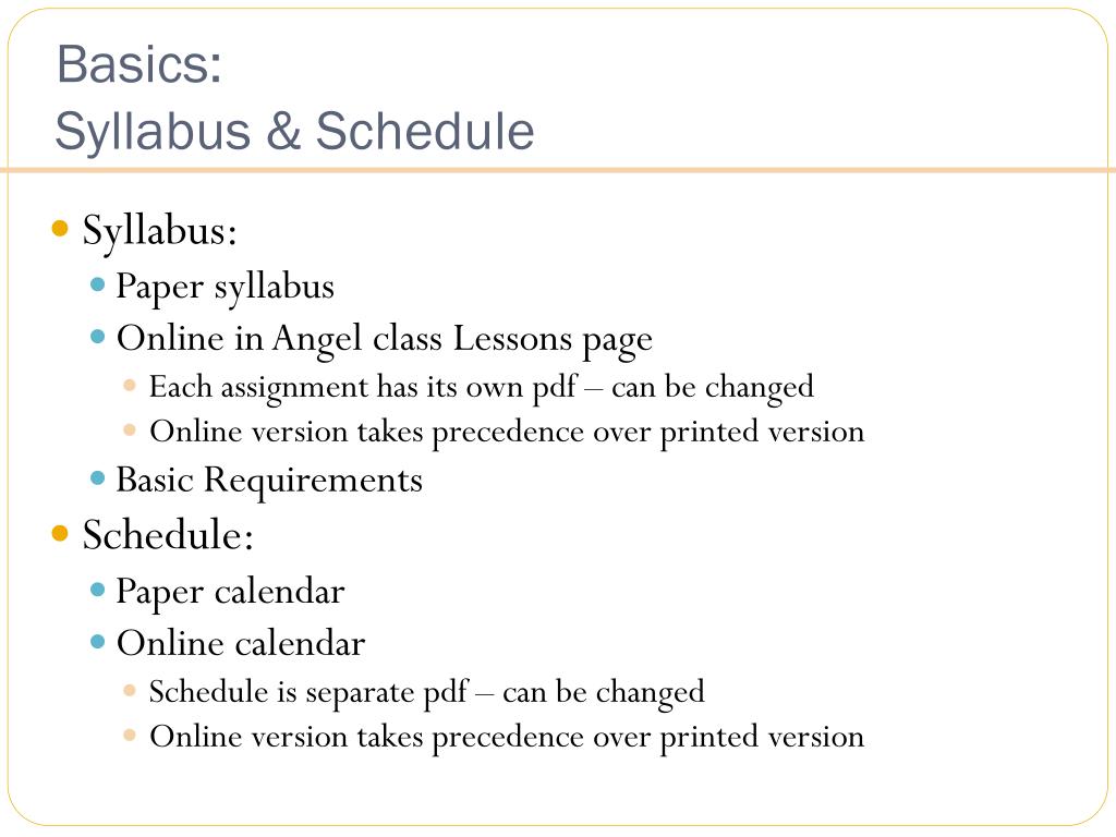 Basics: Syllabus & Schedule • Syllabus: • Paper syllabus • Online in Angel class Lessons page • Each assignment has its own pdf – can be changed • Online version takes precedence over printed version • Basic Requirements • Schedule: • Paper calendar • Online calendar • Schedule is separate pdf – can be changed • Online version takes precedence over printed version