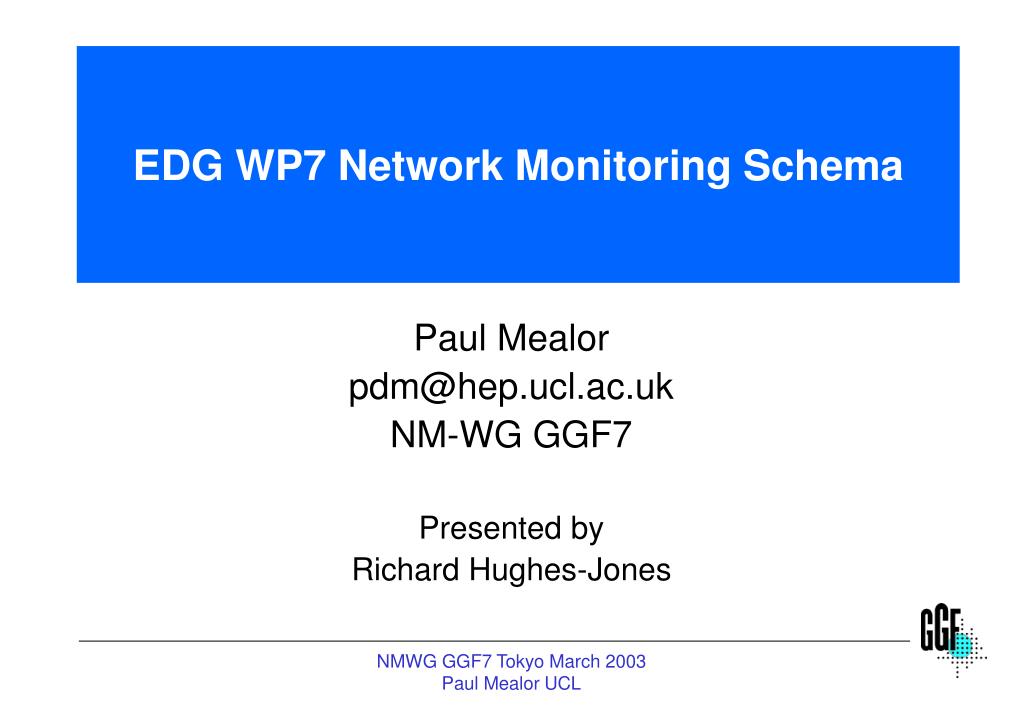 EDG WP7 Network Monitoring Schema Paul Mealor pdm@hep.ucl.ac.uk NM-WG GGF7 Presented by Richard Hughes-Jones NMWG GGF7 Tokyo March 2003 Paul Mealor UCL