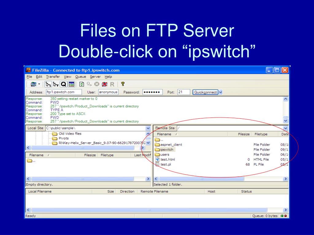 Homework Exercise • Use FileZilla (or WS_FTP95LE or other FTP program) and connect to: • ftp1.ipswitch.com • Log in as an anonymous user • Once logged in you will see a set of files and folders (see next page)