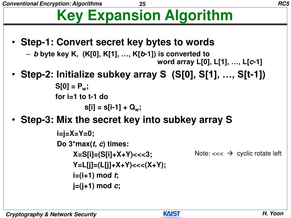 Step-1: Convert secret key bytes to words b byte key K, (K[0], K[1], …, K[b-1]) is converted to word array L[0], L[1], …, L[c-1] Step-2: Initialize subkey array S (S[0], S[1], …, S[t-1]) S[0] = Pw; for i=1 to t-1 do s[i] = s[i-1] + Qw; Step-3: Mix the secret key into subkey array S RC5 Key Expansion Algorithm • i=j=X=Y=0; • Do 3*max(t, c) times: • X=S[i]=(S[i]+X+Y)<<<3; • Y=L[j]=(L[j]+X+Y)<<<(X+Y); • i=(i+1) mod t; • j=(j+1) mod c; Note: <<< cyclic rotate left