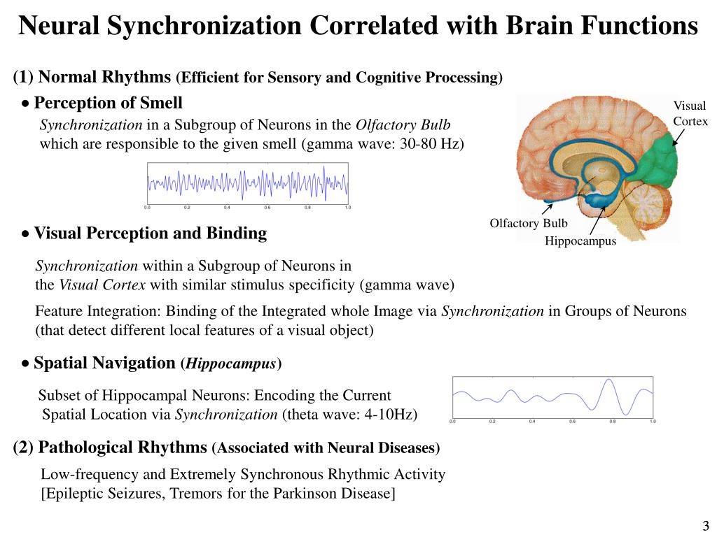 Neural Synchronization Correlated with Brain Functions (1) NormalRhythms (Efficient for Sensory and Cognitive Processing) Perception of Smell Visual Cortex Synchronization in a Subgroup of Neurons in the Olfactory Bulb which are responsible to the given smell (gamma wave: 30-80 Hz) Olfactory Bulb Visual Perception and Binding Hippocampus Synchronization within a Subgroup of Neurons in the Visual Cortex with similar stimulus specificity (gamma wave) Feature Integration: Binding of the Integrated whole Image via Synchronization in Groups of Neurons (that detect different local features of a visual object) Spatial Navigation (Hippocampus) Subset of Hippocampal Neurons: Encoding the Current Spatial Location via Synchronization (theta wave: 4-10Hz) (2) Pathological Rhythms (Associated with Neural Diseases) Low-frequency and Extremely Synchronous Rhythmic Activity [Epileptic Seizures, Tremors for the Parkinson Disease] 3