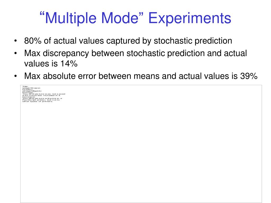 “Multiple Mode” Experiments • 80% of actual values captured by stochastic prediction • Max discrepancy between stochastic prediction and actual values is 14% • Max absolute error between means and actual values is 39%