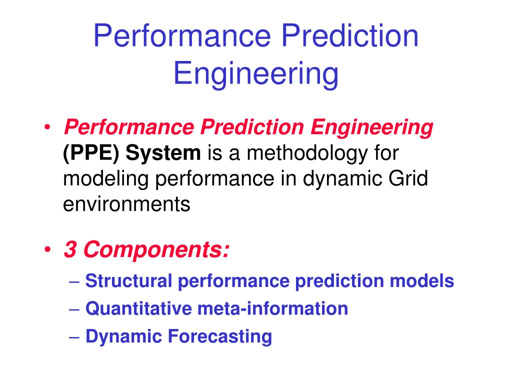 Performance Prediction Engineering • Performance Prediction Engineering(PPE) System is a methodology for modeling performance in dynamic Grid environments • 3 Components: • Structural performance prediction models • Quantitative meta-information • Dynamic Forecasting