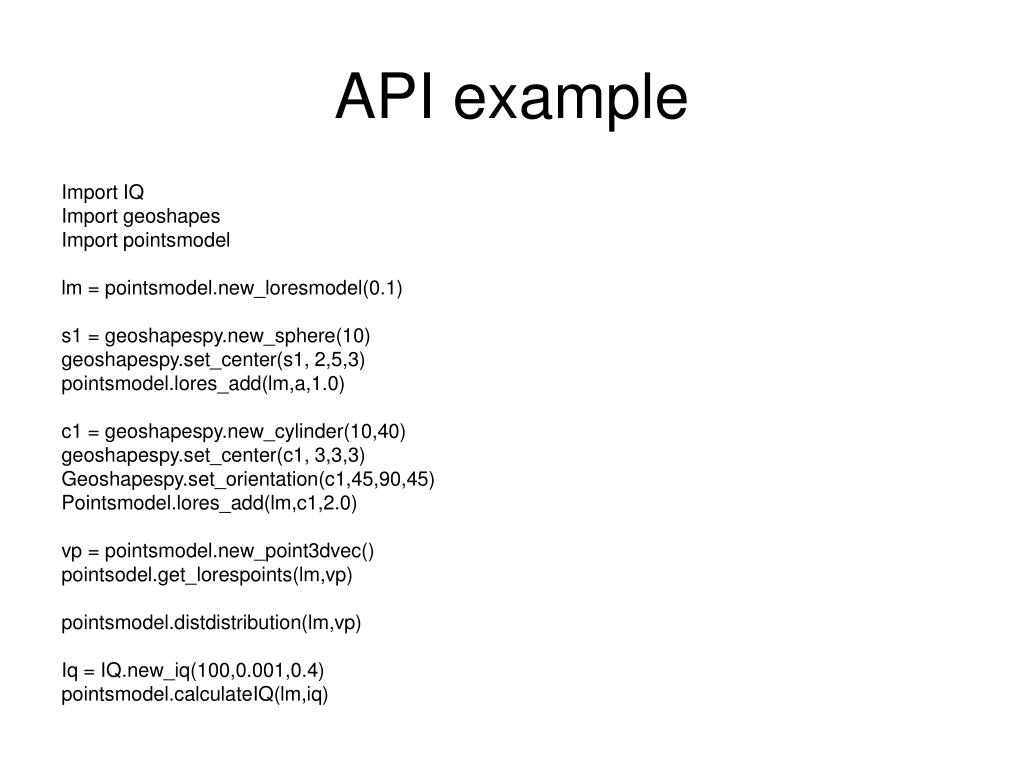 API example Import IQ Import geoshapes Import pointsmodel lm = pointsmodel.new_loresmodel(0.1) s1 = geoshapespy.new_sphere(10) geoshapespy.set_center(s1, 2,5,3) pointsmodel.lores_add(lm,a,1.0) c1 = geoshapespy.new_cylinder(10,40) geoshapespy.set_center(c1, 3,3,3) Geoshapespy.set_orientation(c1,45,90,45) Pointsmodel.lores_add(lm,c1,2.0) vp = pointsmodel.new_point3dvec() pointsodel.get_lorespoints(lm,vp) pointsmodel.distdistribution(lm,vp) Iq = IQ.new_iq(100,0.001,0.4) pointsmodel.calculateIQ(lm,iq)