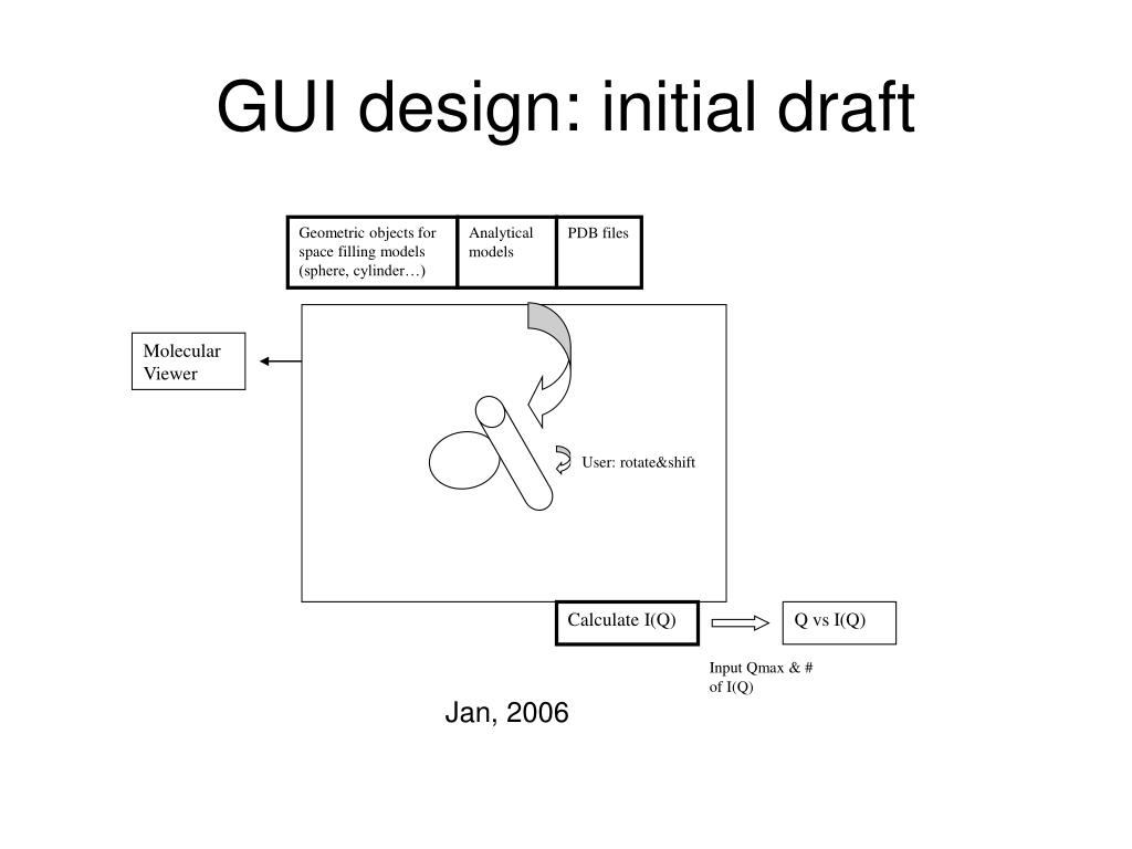 Geometric objects for space filling models (sphere, cylinder…) Analytical models PDB files Molecular Viewer User: rotate&shift Calculate I(Q) Q vs I(Q) Input Qmax & # of I(Q) GUI design: initial draft Jan, 2006