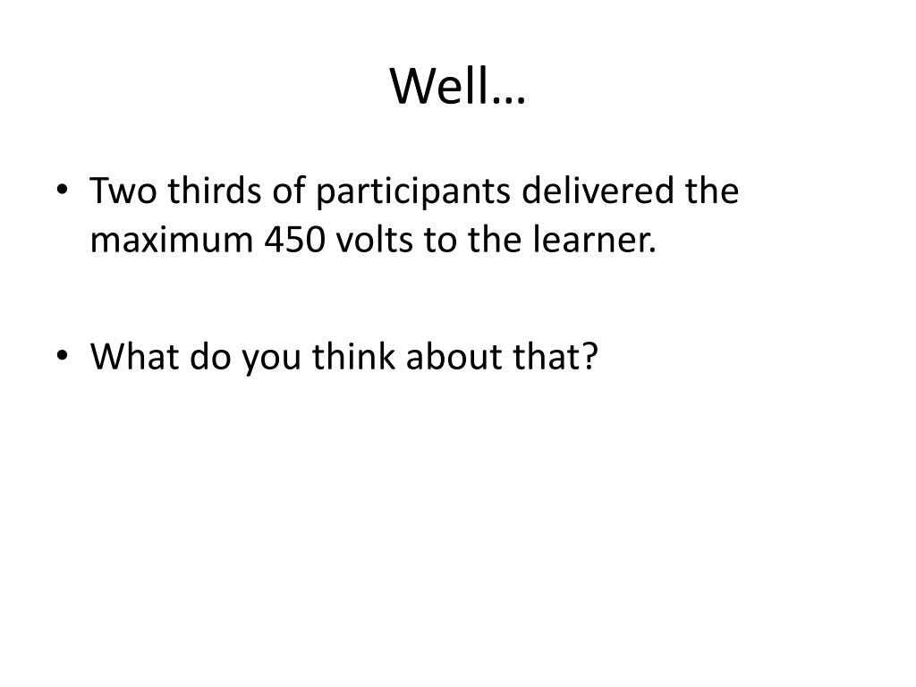Well… • Two thirds of participants delivered the maximum 450 volts to the learner. • What do you think about that?