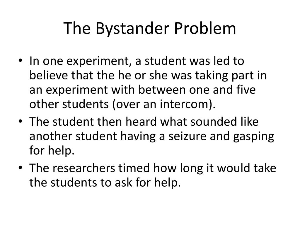 The Bystander Problem • In one experiment, a student was led to believe that the he or she was taking part in an experiment with between one and five other students (over an intercom). • The student then heard what sounded like another student having a seizure and gasping for help. • The researchers timed how long it would take the students to ask for help.