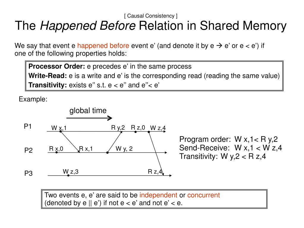 global time P1 R z,0 R y,2 W x,1 W z,4 Program order: W x,1< R y,2 Send-Receive: W x,1 < W z,4 Transitivity: W y,2 < R z,4 R x,0 R x,1 W y, 2 P2 W z,3 R z,4 P3 [ Causal Consistency ]The Happened Before Relation in Shared Memory We say that event e happened before event e’ (and denote it by e e’ or e < e’) if one of the following properties holds: Processor Order: e precedes e’ in the same process Write-Read: e is a write and e’ is the corresponding read (reading the same value) Transitivity: exists e’’ s.t. e < e’’ and e’’< e’ Example: Two events e, e’ are said to be independent or concurrent(denoted by e || e’) if not e < e’ and not e’ < e.