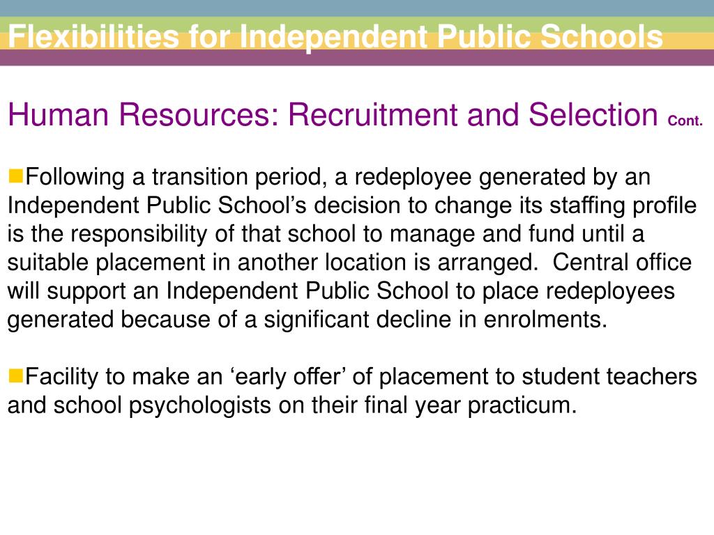 Flexibilities for Independent Public Schools • Human Resources: Recruitment and Selection • Authority to select all staff, including fixed term staff, and the management of expressions of interest. • Exemption from central placement processes, including the central transfer process and placement of redeployees. This does not preclude redeployees from applying for positions advertised in Independent Public Schools.