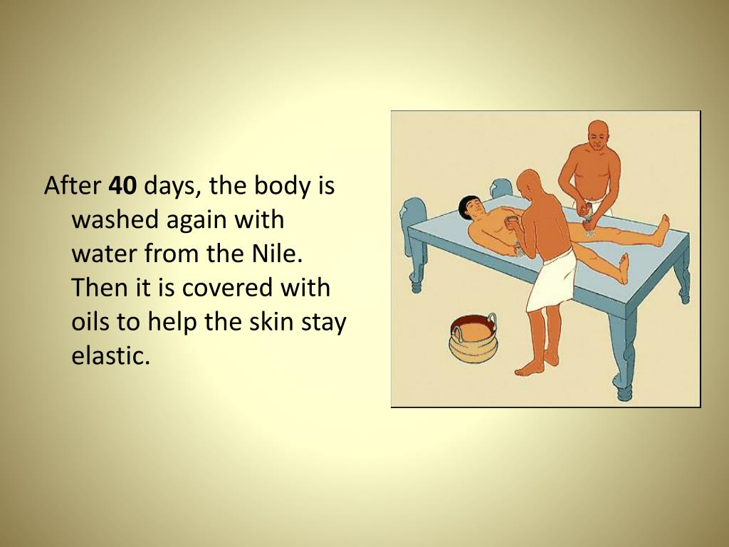 After 40 days, the body is washed again with water from the Nile. Then it is covered with oils to help the skin stay elastic.