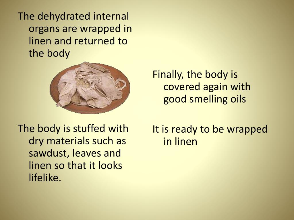 The dehydrated internal organs are wrapped in linen and returned to the body The body is stuffed with dry materials such as sawdust, leaves and linen so that it looks lifelike. Finally, the body is covered again with good smelling oils It is ready to be wrapped in linen