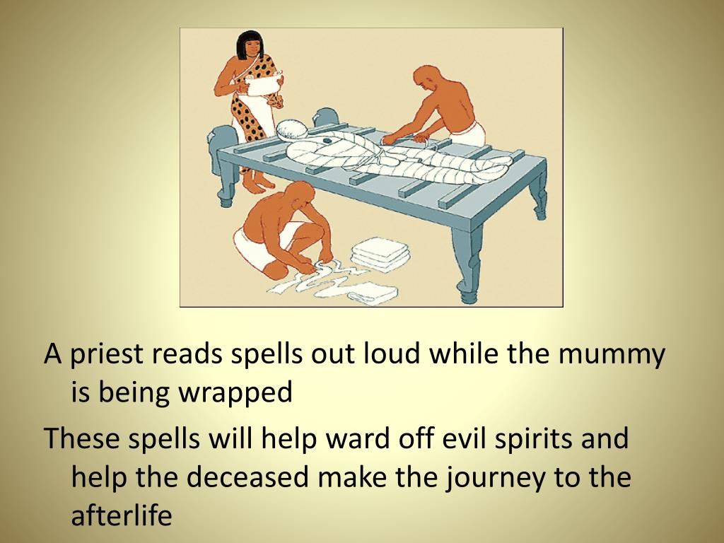 A priest reads spells out loud while the mummy is being wrapped These spells will help ward off evil spirits and help the deceased make the journey to the afterlife