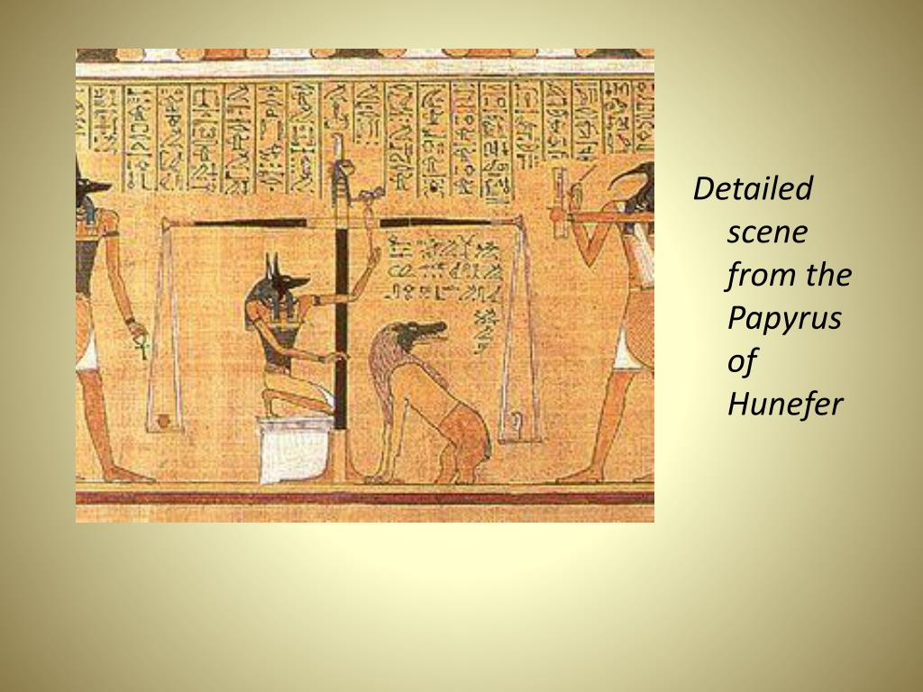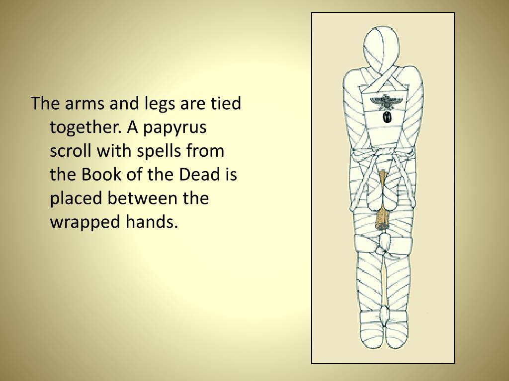 The arms and legs are tied together. A papyrus scroll with spells from the Book of the Dead is placed between the wrapped hands.