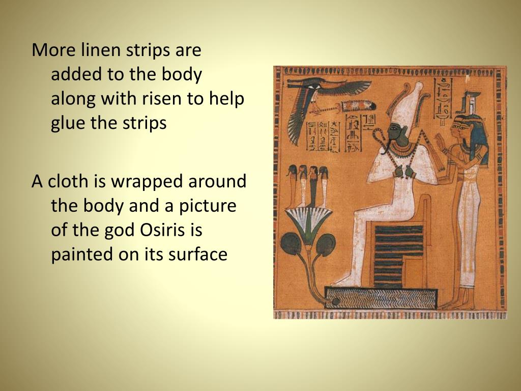 More linen strips are added to the body along with risen to help glue the strips A cloth is wrapped around the body and a picture of the god Osiris is painted on its surface