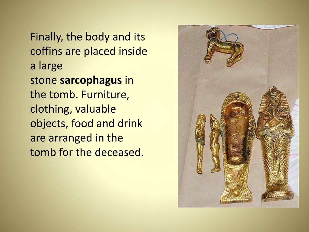 Finally, the body and its coffins are placed inside a large stone sarcophagus in the tomb. Furniture, clothing, valuable objects, food and drink are arranged in the tomb for the deceased.