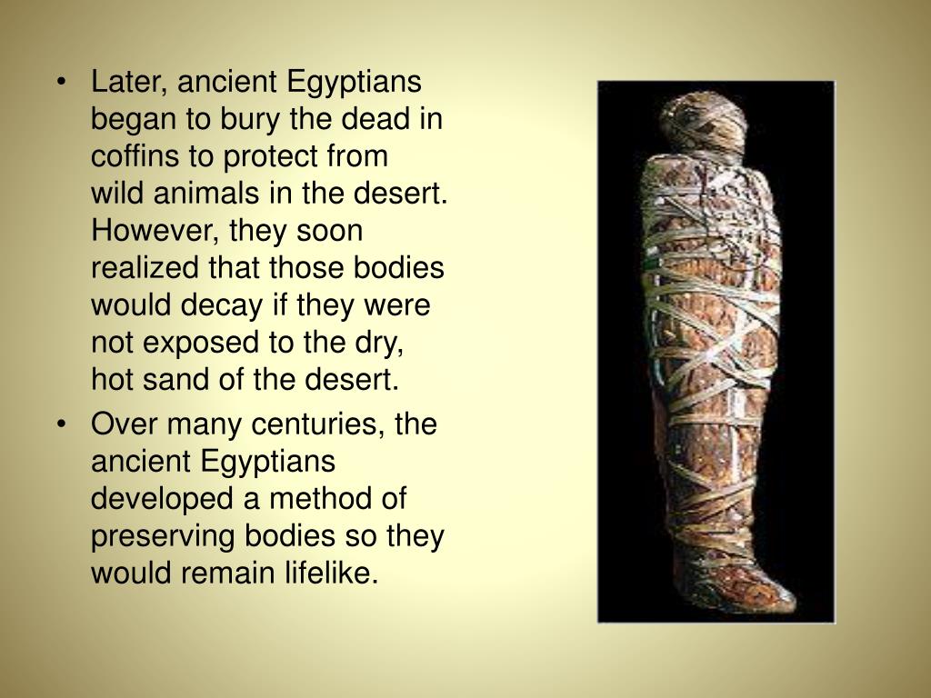 Later, ancient Egyptians began to bury the dead in coffins to protect from wild animals in the desert. However, they soon realized that those bodies would decay if they were not exposed to the dry, hot sand of the desert. • Over many centuries, the ancient Egyptians developed a method of preserving bodies so they would remain lifelike.