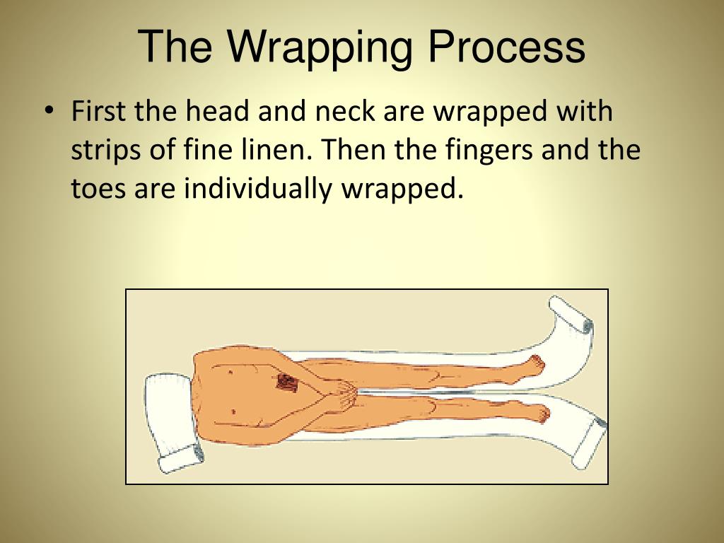 The Wrapping Process • First the head and neck are wrapped with strips of fine linen. Then the fingers and the toes are individually wrapped.