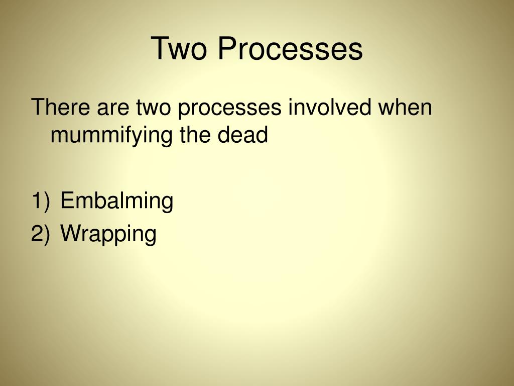 Two Processes There are two processes involved when mummifying the dead • Embalming • Wrapping