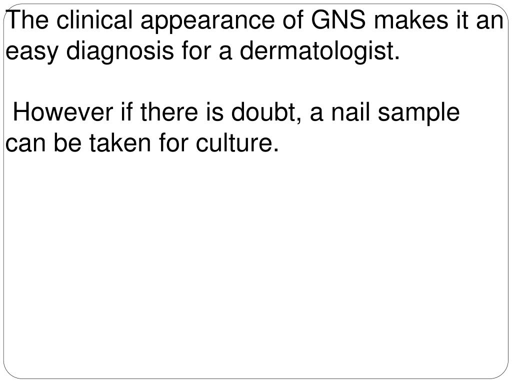 The clinical appearance of GNS makes it an easy diagnosis for a dermatologist. However if there is doubt, a nail sample can be taken for culture.