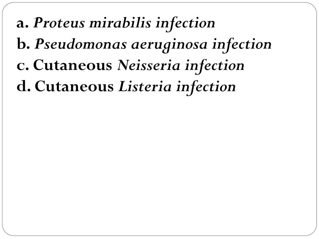 a. Proteus mirabilis infection b. Pseudomonas aeruginosa infection c. CutaneousNeisseria infection d. CutaneousListeria infection