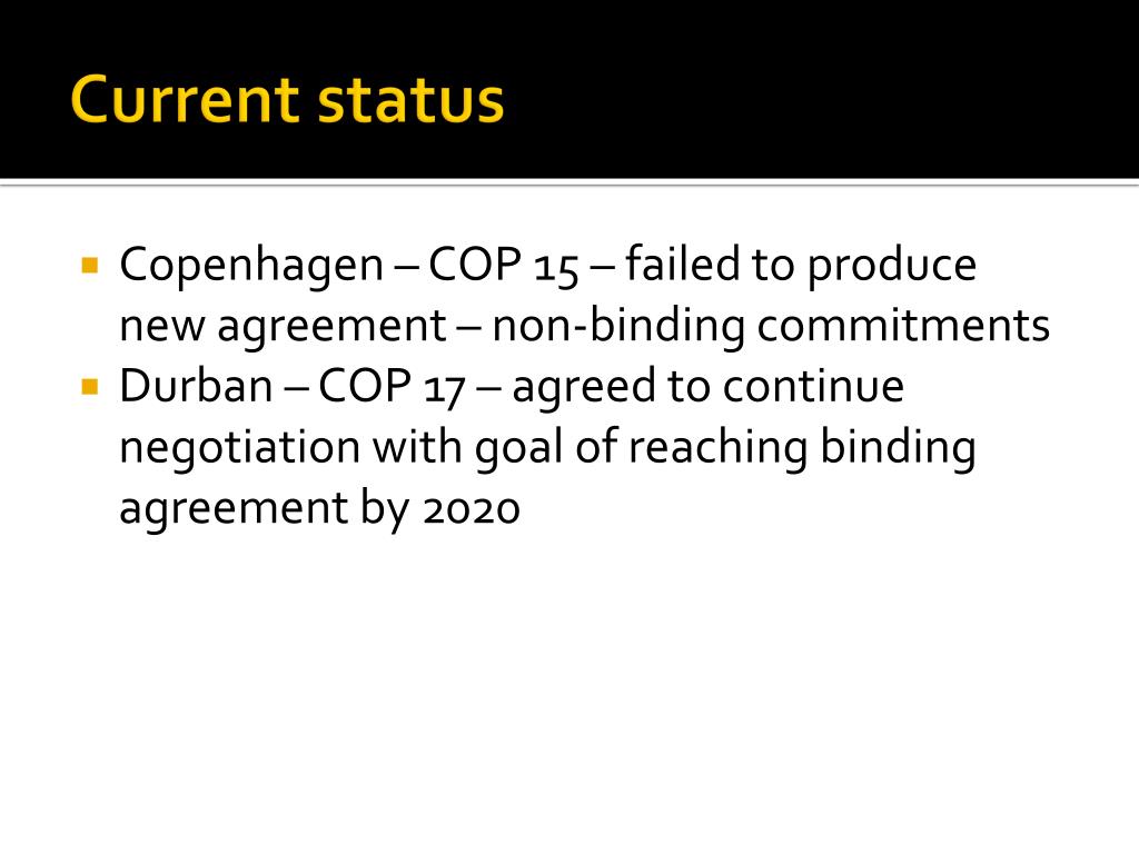 Current status • Copenhagen – COP 15 – failed to produce new agreement – non-binding commitments • Durban – COP 17 – agreed to continue negotiation with goal of reaching binding agreement by 2020