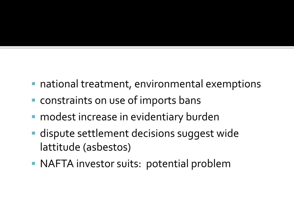 national treatment, environmental exemptions • constraints on use of imports bans • modest increase in evidentiary burden • dispute settlement decisions suggest wide lattitude (asbestos) • NAFTA investor suits: potential problem